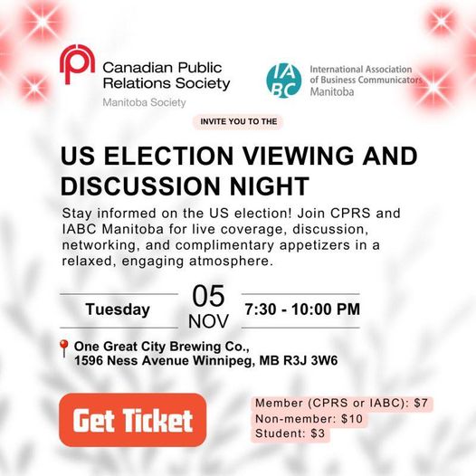 Stay informed on the US election! Join CPRS and IABC Manitoba for live coverage, discussion, networking, and complimentary appetizers in a relaxed, engaging atmosphere.